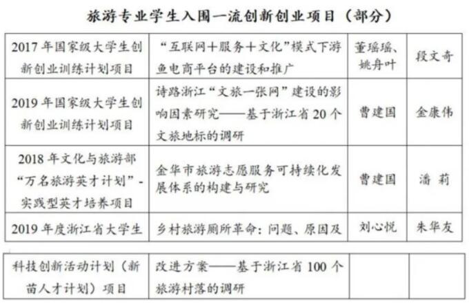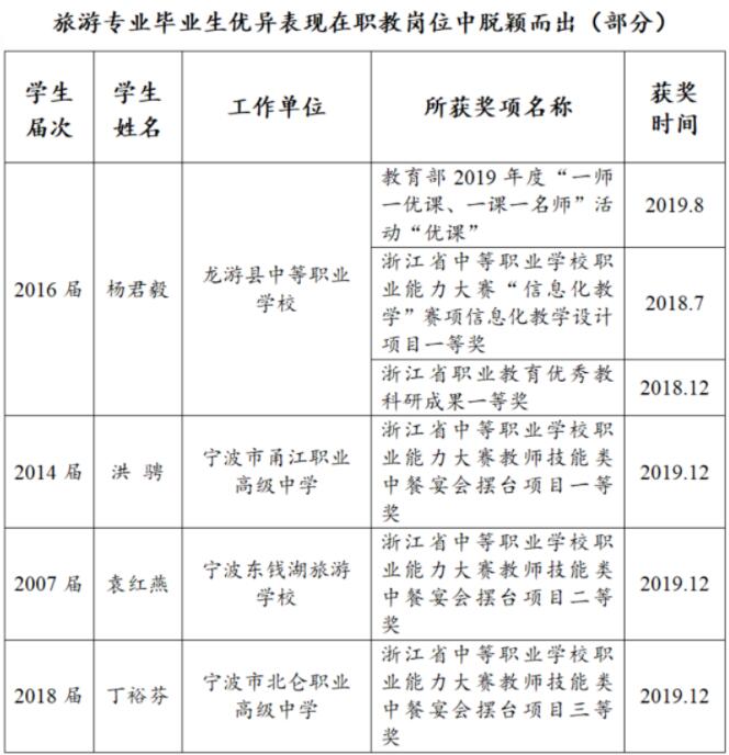 目前,旅游管理专业已有1200多位毕业生活跃在浙江省内外的各类旅游企业和中职院校,其中不少人已成长为所在单位的骨干。每年都有学生考上国内外知名学府的研究生,如毕业生赵蒨就考取了香港理工大学。