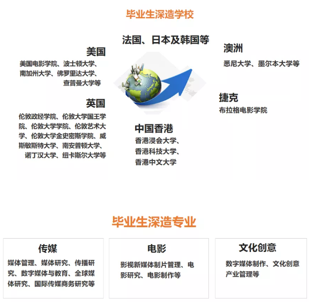 职业发展上面,毕业同学大多会选择(1)国内外影视学院或相关传媒专业继续深造。或者(2)影视产品管理,新媒体制作者,文化创意工作者, 视觉创意艺术管理,研究者,策划、公关、电视 策划、经营。
