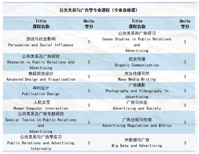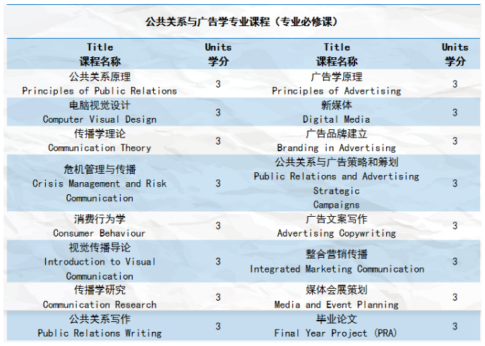 本专业具有跨学科、综合性、实践性强的特点,学生在国际化视野下系统学习传播学、广告学、公共关系学等基本原理及知识,具备国际视野,能流利运用英语,掌握现代传播沟通理论和方式方法,熟悉掌握现代媒体,包括传统媒体和新媒体的传播规律,具备沟通、调研、策划和自主创新能力。
