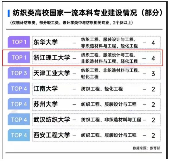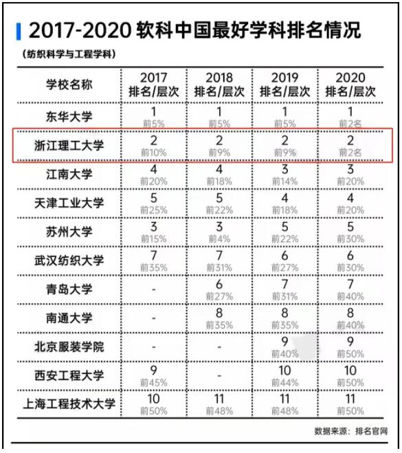 近些年,浙江理工大学在中国纺织学科领域发展迅速,拥有较强的学科实力和发展潜力,且拥有“纺织科学与工程”一级博士学位点,居于学科第一梯队。