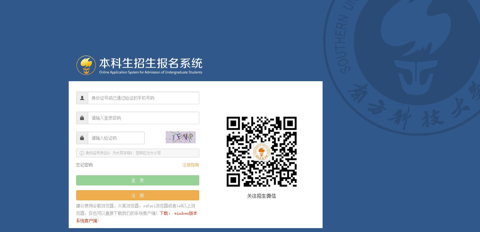 符合条件的同学请登录南方科技大学招生网上报名系统http://register.sustech.edu.cn/,按照有关步骤进行报名。请勿使用IE(6、7、8、9)浏览器,推荐使用Chrome、IE10.0及以上版本、firefox等浏览器进行访问,避免网上报名过程中出现问题。