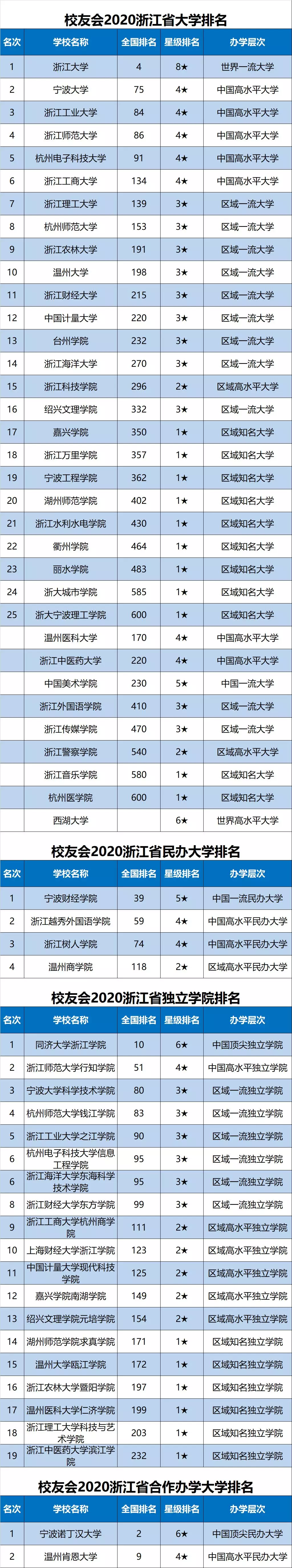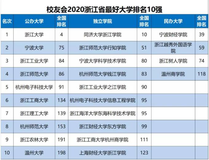 校友会2020浙江省大学排名发布,浙江大学雄居全国前4强