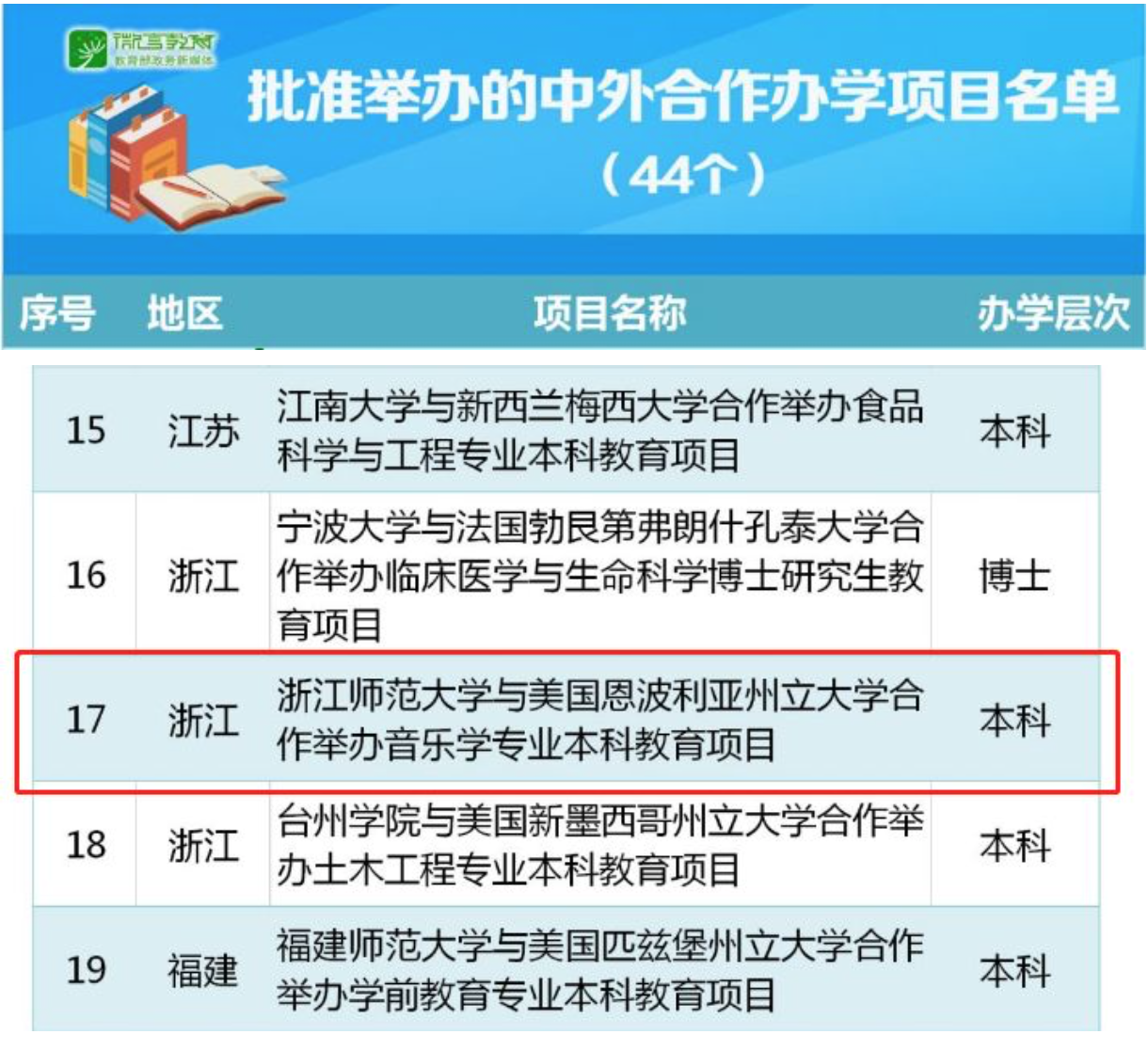 为满足社会对高素质、复合型、国际化音乐教育人才的需求,经教育部批准,自2020年开始,浙江师范大学与美国恩波利亚州立大学联合开展音乐学专业本科教育合作办学项目,纳入国家普通高等教育招生计划(其中浙江省在艺术类第一批招生),颁发浙江师范大学毕业证书和学士学位证书,第四年赴美学习并达到美方毕业要求可获美国恩波利亚州立大学学士学位证书。