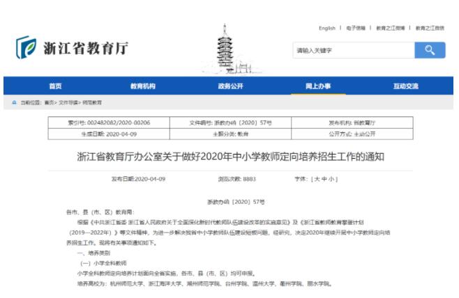 为进一步解决浙江省中小学教师队伍建设短板问题,日前,省教育厅发布《浙江省教育厅办公室关于做好2020年中小学教师定向培养招生工作的通知》(浙教办函〔2020〕57号)文件,决定2020年继续开展中小学教师定向培养招生工作,并要求省内县级及以上人民政府在2020年4月23日之前以正式文件的形式向申报教师定向培养需求。