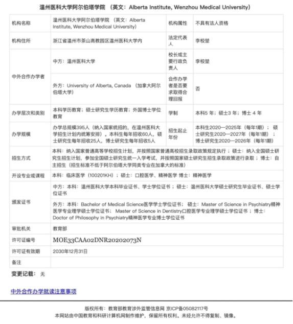 联合学院英文名为“Alberta Institute, Wenzhou Medical University”,是全国首个聚焦临床医学的合作办学机构,今年将启动首批招生。将开设临床医学本科专业,口腔医学、精神医学硕士专业和精神医学博士专业,办学总规模为395人,其中本科生每年招收60人,硕士研究生每年招收25人,博士研究生每年招收5人。本科生纳入国家普通高等学校招生计划,参加高考,并符合相关招生录取规定和要求;硕士研究生纳入全国研究生招生计划,参加全国统一研究生招生考试,并符合相关要求。毕业后,中外方均将为学生颁发相应的学位证书。博士研究生实施自主招生,毕业后颁发外方学位证书。