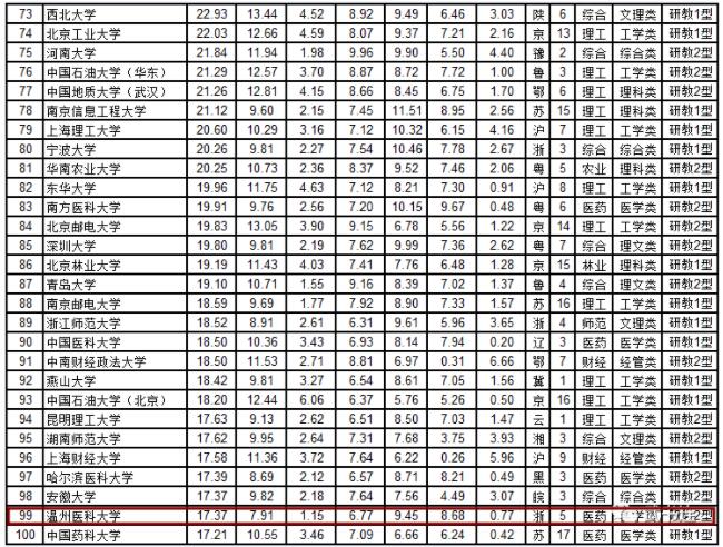 △有17所非双一流大学综合实力进入前100名,温州医科大学位居其列。