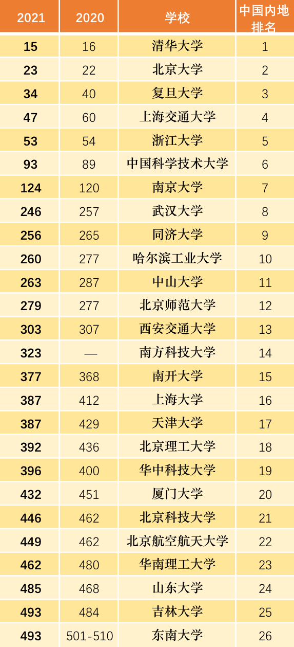 转眼到中国高校,其中清华大学位列世界第15名,上升了1位,是唯一进入前20名的中国大学;香港大学上升3位,位列香港地区高校首位,世界排名22;且大部分中国内地和香港院校排名都有所上升!