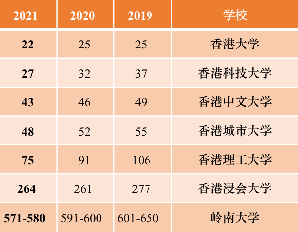 香港地区共有7所大学上榜,其中有5所打入全球前100位: