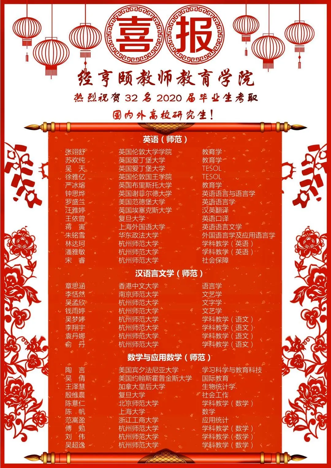 祝贺杭师大经亨颐学院2020届32名本科毕业生考取国内外高校研究生