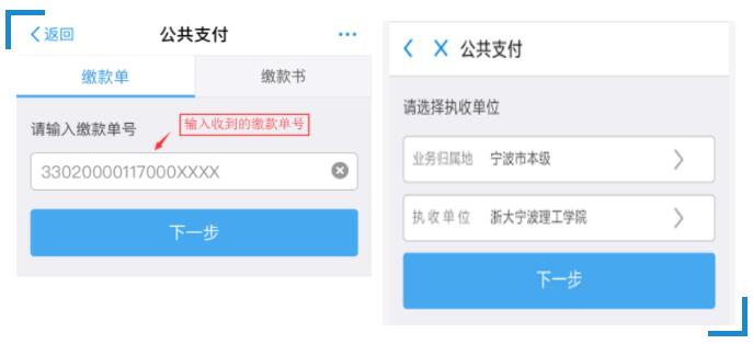 (2)“按身份信息”缴费输入:输入身份证信息后,点击“下一步”,“业务归属地”选择“宁波市本级”,执收单位选择“浙大宁波理工学院”,点击“下一步”;