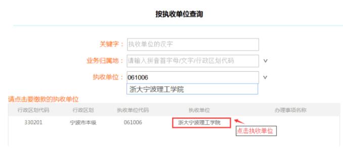 (2)输入:输入身份证号码,点击“下一步”按钮;执收单位填入061006 ,跳出“浙大宁波理工学院”后点击下方出现的执收单位;