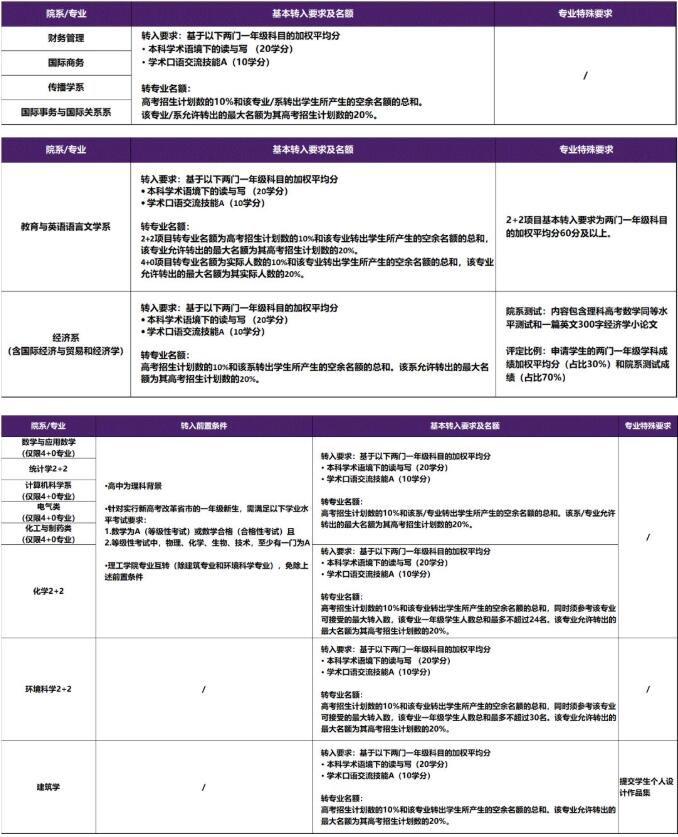 具体专业转入要求及转入名额请参见下列表格: