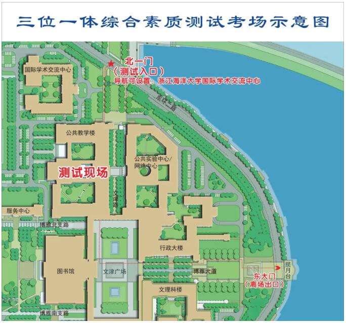 2.测试地点及报到入口:测试地点在浙江海洋大学新城校区公共教学楼。报到入口设在学校北一门。进校后到准考证上指定的集中教室报到。