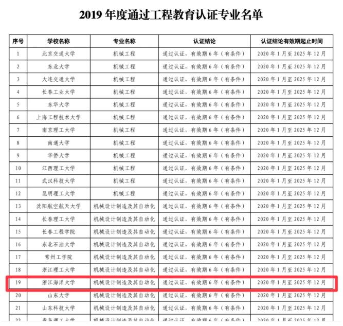 浙江海洋大学的机械设计制造及其自动化专业通过中国工程教育专业认证