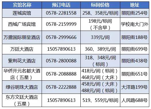 2.报到地点:丽水学院附近两所宾馆的大堂,考生可任选其一(校内不再设报到点);两所宾馆为:莲城宾馆(丽阳街254号)、万盛国际丽呈酒店(丽阳街188号)。报到当天下午考生可以自行前往校内熟悉考场。