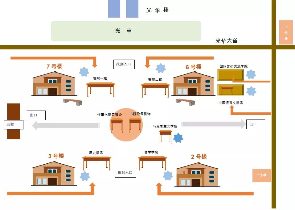 提示:如遇高峰期,可先到宿舍办理入住手续,将行李存放在寝室后,再携带相关材料前往班级摊位报到。