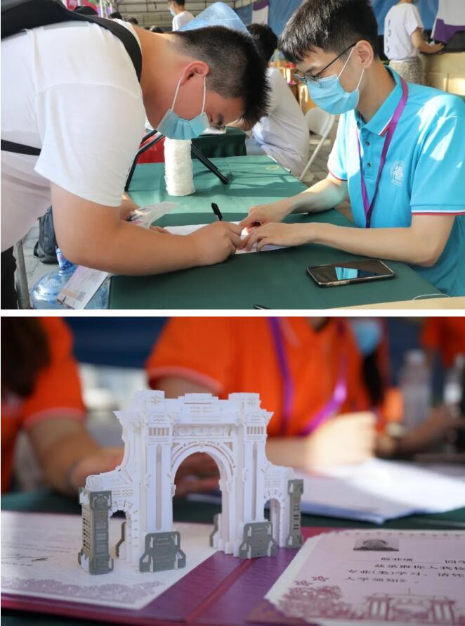 等候多时的迎新志愿者和老师早已将现场布置得井井有条,新生在他们的指引和帮助下,快速完成报到手续,并领取到内含防疫指南、新生手册、作业纸和书院纪念衫等在内的“新生大礼包”,快速开启自己在清华丰富多彩的大学生活。