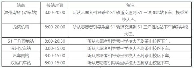 9月18日当天,在温州南站(动车站)、温州火车站、汽车南站、双屿汽车站、龙湾机场、S1三洋湿地站都有安排志愿者迎接大家,这些志愿者由温州医科大学老师和学长学姐组成,新生下车后请认准温州医科大学迎新牌。