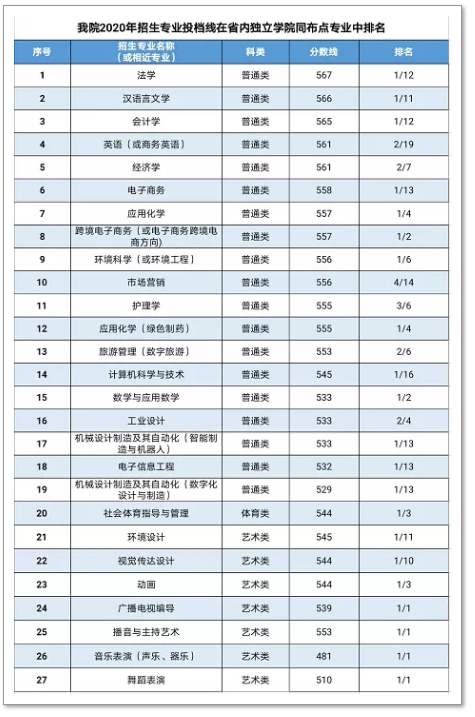 19个普通类招生专业方向与省内独立学院相同专业(类)相比,有13个排名第一,4个排名第二,1个第三,1个第四。