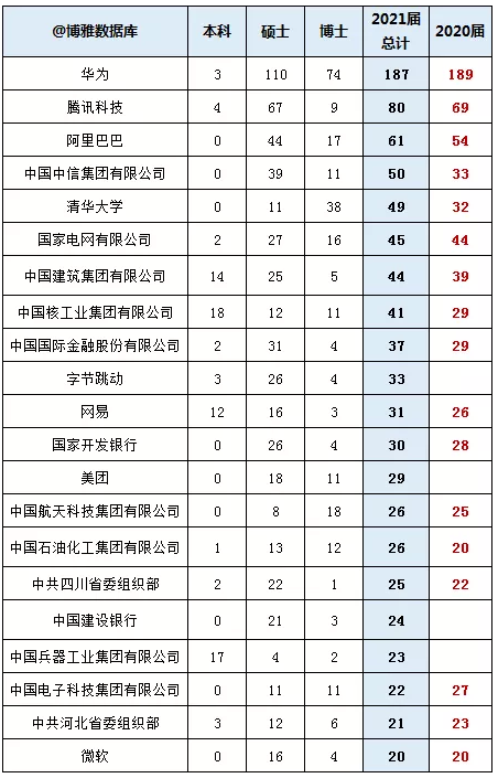 深造人数超过 20 人的大学 包括:哥伦比亚大学(26 人)、牛津大学(24 人)、加州大学伯克利分校(22 人)、 卡耐基梅隆大学(22 人)、密歇根大学安娜堡分校(21 人)、东京大学(21 人)。