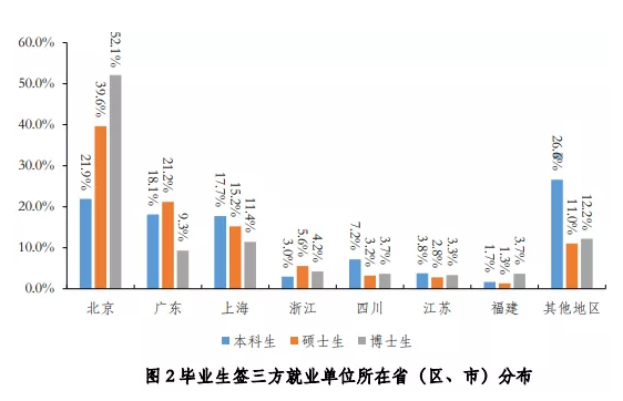 博士就业地点:北京52.1%,广东9.3%,上海11.4%,浙江4.2%,江苏3.3%…