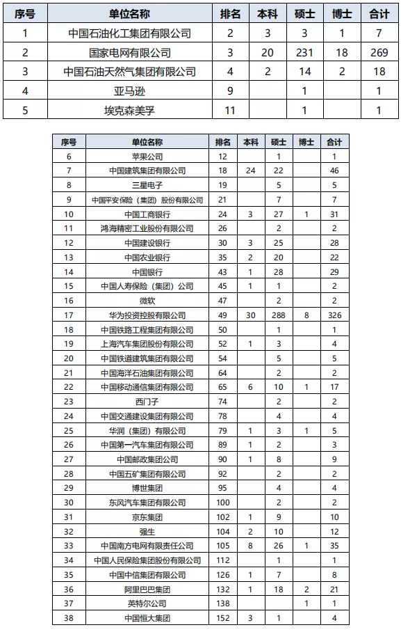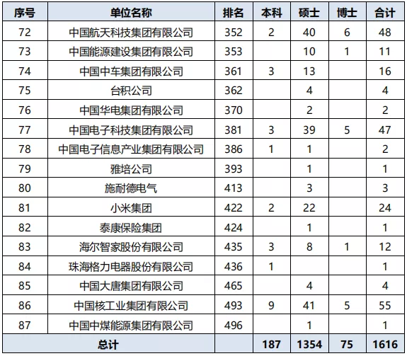 其中本科生 187 人、硕士生 1354 人、博士生75 人。就业单位为 87 家,占 500 强企业数的 17.40%。