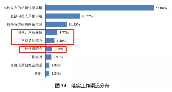 比例最高的为本校发布的招聘信息渠道(53.06%),高于去年 1 个百分点;其次为直接向用人单位申请(16.72%);第三为校外各类招聘网站信息(10.35%)。
