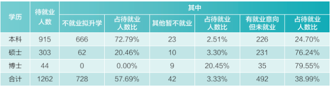 ·全校 1262名待就业毕业生中,有915名本科生,其中666人准备继续考研、等待出国,占待就业总人数的72.79%。