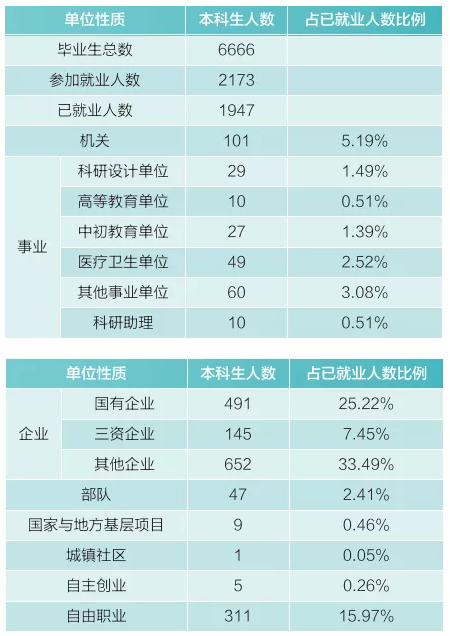 企业为本科毕业生就业主体,占参加就业毕业生总数的59.27%,其次是事业单位和机关单位,分别占8.51% 和 4.65%。