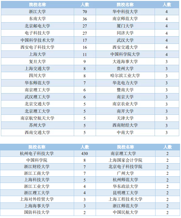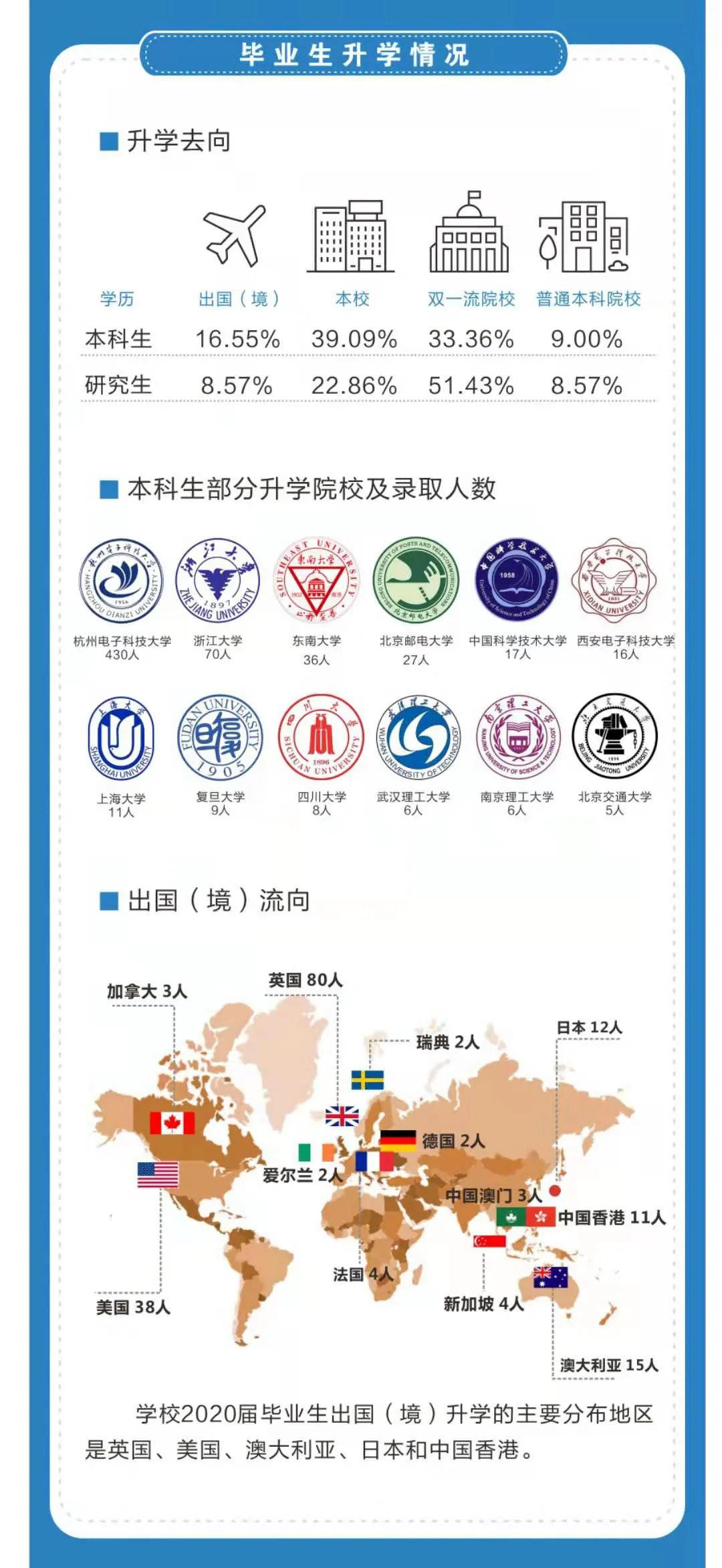 研究生升学主要流向杭州电子科技大学(8 人)、浙江大学5人、上海外国语大学 2 人、华南理工大学2人等。