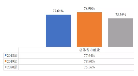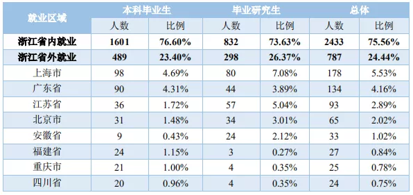 浙江省内为学校 2020 届毕业生主要就业地区,占比为 75.56%;其中,本科毕业生省内就业占比为 76.60%,毕业研究生省内就业占比为 73.63%。