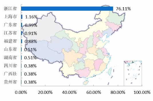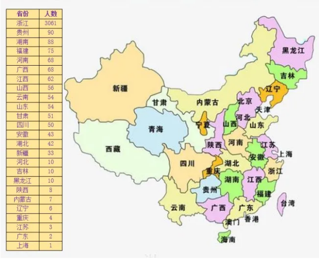 全国流向:浙江省(3011人,76.11%)、上海市(46人,1.16%)、广东省(39人,0.99%)。
