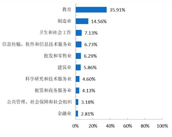 主要集中在“教育”(35.91%)、“制造业”(14.56%)、卫生和社会工作(7.13%)。