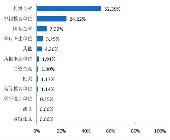 主要就业单位类型为国有企业和三资企业之外的所有企业——“其他企业”(52.39%);其次为“中初教育单位”(24.22%)。