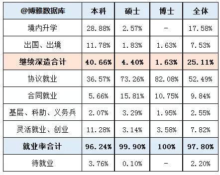 ·国内升学率较上届略升,但考研意愿依然不强烈,本科毕业就可实现理想,就业质量较高。