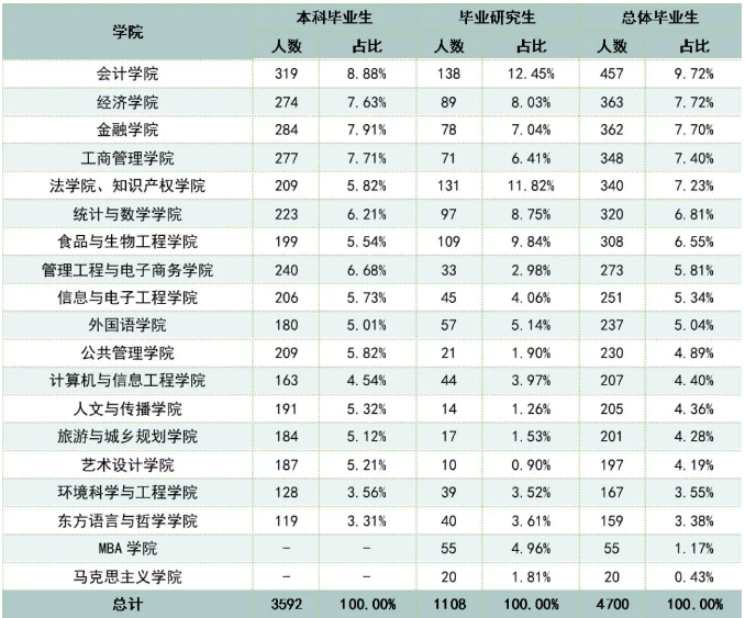 学院结构:学校2020届毕业生分布在19个学院。毕业生人数位列前三的学院分别是会计学院、经济学院、金融学院。