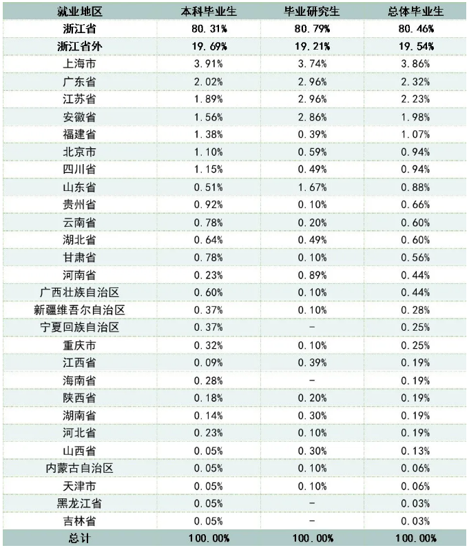 服务地方发展,毕业生就业地区主要集中在浙江省内,就业人数占比为80.46%,浙江省内主要就业城市为杭州、宁波、温州。非浙江省就业人数占比为19.54%,就业人数位列前三的地区分别为:上海市、广东省、江苏省。