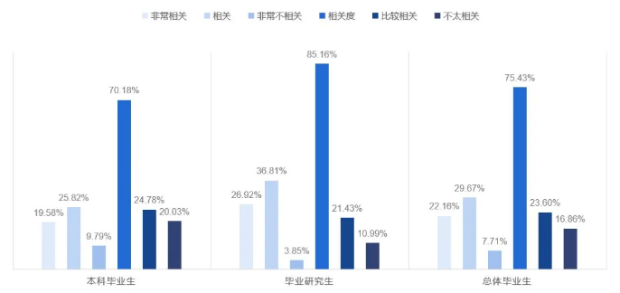 毕业生目前就业与专业的相关度为75.43%,其中本科毕业生就业专业相关度为70.18%,毕业研究生就业专业相关度为85.16%,均高于2019届本科生(63.98%)和研究生(78.25%)水平。