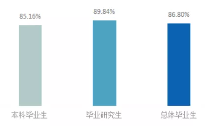 毕业生总体就业满意度为86.80%。本科毕业生的就业满意度为85.16%,毕业研究生的就业满意度为89.84%。
