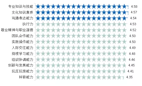 用人单位对毕业生各项能力的评价中,评价较高的为“专业知识与技能”、“文化知识素养”、“沟通表达能力”。