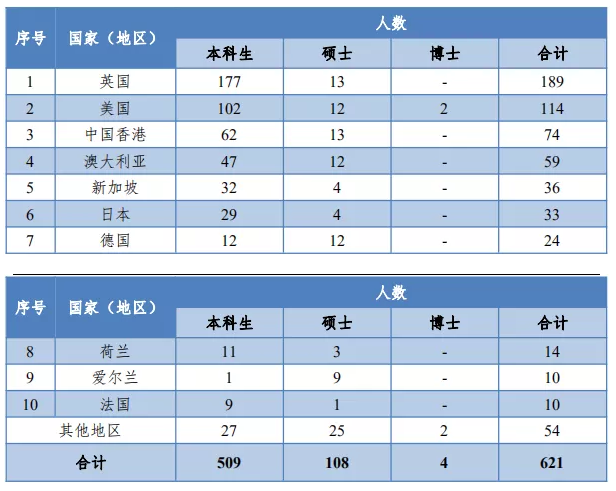 境外留学:人数与上届持平,去英国、新加坡增加,去美国、香港、澳大利亚减少。