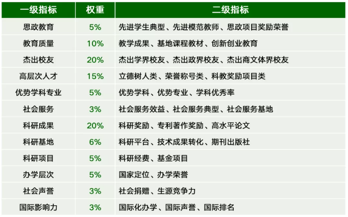 校友会2021中国大学排名评价指标体系由12个一级指标构成,详情如下: