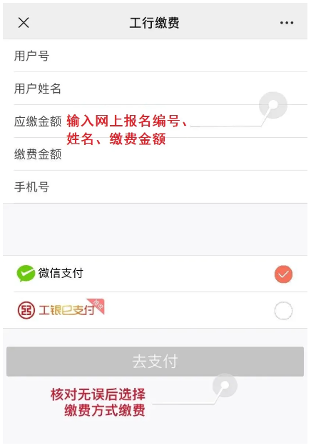 请仔细核对网上报名编号、姓名、缴费金额等信息,确认信息无误再付款缴费,切记!!!