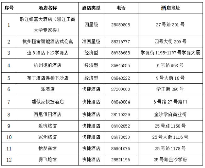 浙江工商大学下沙校区周边酒店信息表