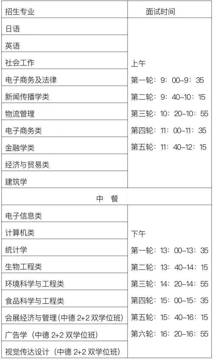 2、报到时间:4月11日,根据专业,分上午场和下午场分别报到、面试。上午场报到时间为7:30-8:50,下午场报到时间为12:00-13:20,逾期按放弃测试处理。