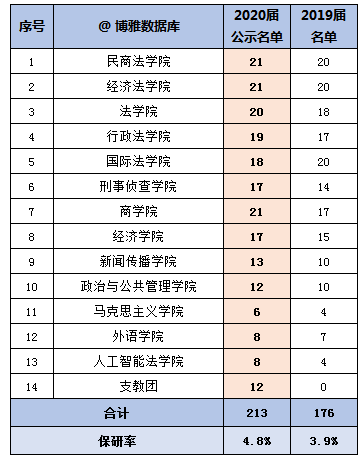 根据西南政法大学2020届保研公示:2020届推免生共213人,其中包括普通名额201名、支教团12名成员。