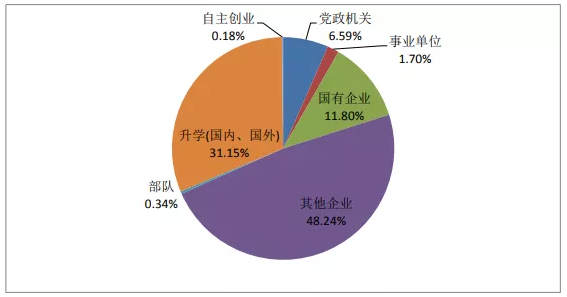本科毕业生就业选择最多的是其他企业(占 48.24%。其中含到律师事务所就业毕业生 341 人,占 8.81%);其次为升学(国内、国外),占 31.15%;再次为国有企业,占 11.80%。