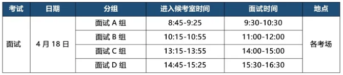 面试考生凭身份证原件、准考证参加面试,两证不齐不得参加考试。参加面试的考生将被分为四组。请获得面试资格的考生通过招生办公布的信息,查询自己的面试到达时间及教室,在面试正式开始前5分钟禁止考生进入教学楼;