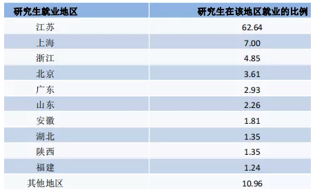 主要留在江苏就业。其中,研究生省内 就业占比为 62.64%,本科生省内就业占比为 63.61%。