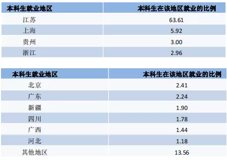 本科毕业生省内就业主要流向了南京市 51.70%,苏州市 13.71%和无锡市 6.79%。